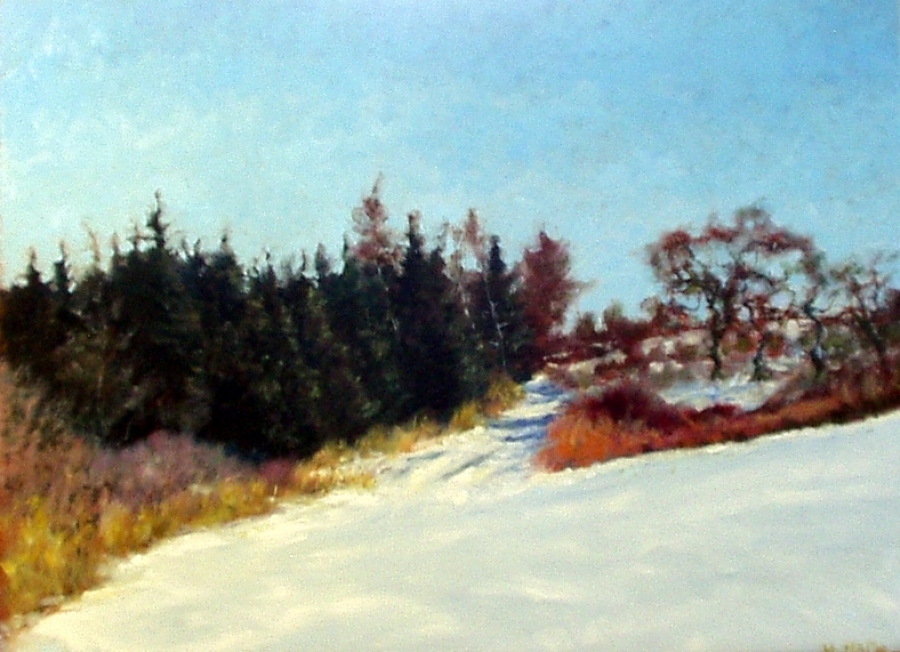 A conifer plantation of Balsam Fir, White Pine and Norway Spruce on the left and a very old orchard (80+ yrs.) on a clear, cold February day in 2011.
