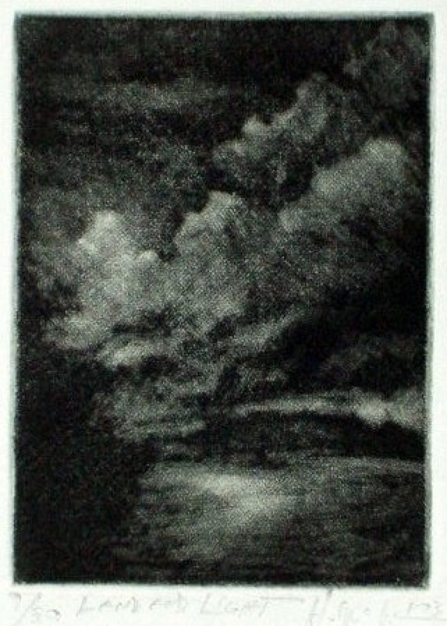 Date:2003 This print is based on a tiny oil sketch I did of a farm field with some very dramatic cloud formations on a summer morning. I deliberately used a course grained mezzotint rocker for its grainy effect. Edition:30 Exhibited: 60 Square Inches, Purdue University, Indiana, 2004, purchased for permanent collection; Works on Paper, Maryland Federation of the Arts, Annapolis, MD, 2005; Print Show, Upstairs Gallery, Ithaca,NY, 2005; Faculty Show, Handwerker Gallery, Ithaca College, Ithaca, NY,2005; 16th Annual Mini-Print Show, Binghamton University Art Gallery, Binghamton, NY,2008; Harry McCue at Kendall at Ithaca, Ithaca, NY, 2011.