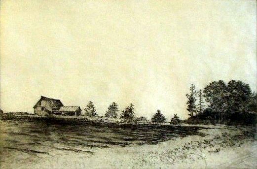 A view I passed every day on the way home from work. The barn was burned. I did a ball point pen drawing of it in 1984 and based this etching on that. The plate was completed in July of 2004.