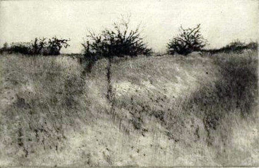 edition of 25 A drypoint intaglio print looking South from my old apple orchard. This print was done in February of 2005 and is based on a ball point pen drawing I did for my Tokaido series.This print has some retrousage, aka selective wiping. It is it's charm but I am reminded when I use it of a remark one of my printmaking professors at Pratt said to me once,"McCue, get it in the zinc, not in the ink"! Exhibited:Global Matrix, Purdue University, Purdue, Indiana, 2007; Prince Gallery,University of Wisconsin, Oshkosh, Wisc.2007; Higgins Art Gallery, Cape Cod Community College, W. Barnstable, Mass.,2007; Wright State University, Dayton, Ohio, 2008; Altgeld Gallery, N. Illinois University, Dekalb, Ill., 2008; Maryland Federation of the Arts, Annapolis, MD, 2008.