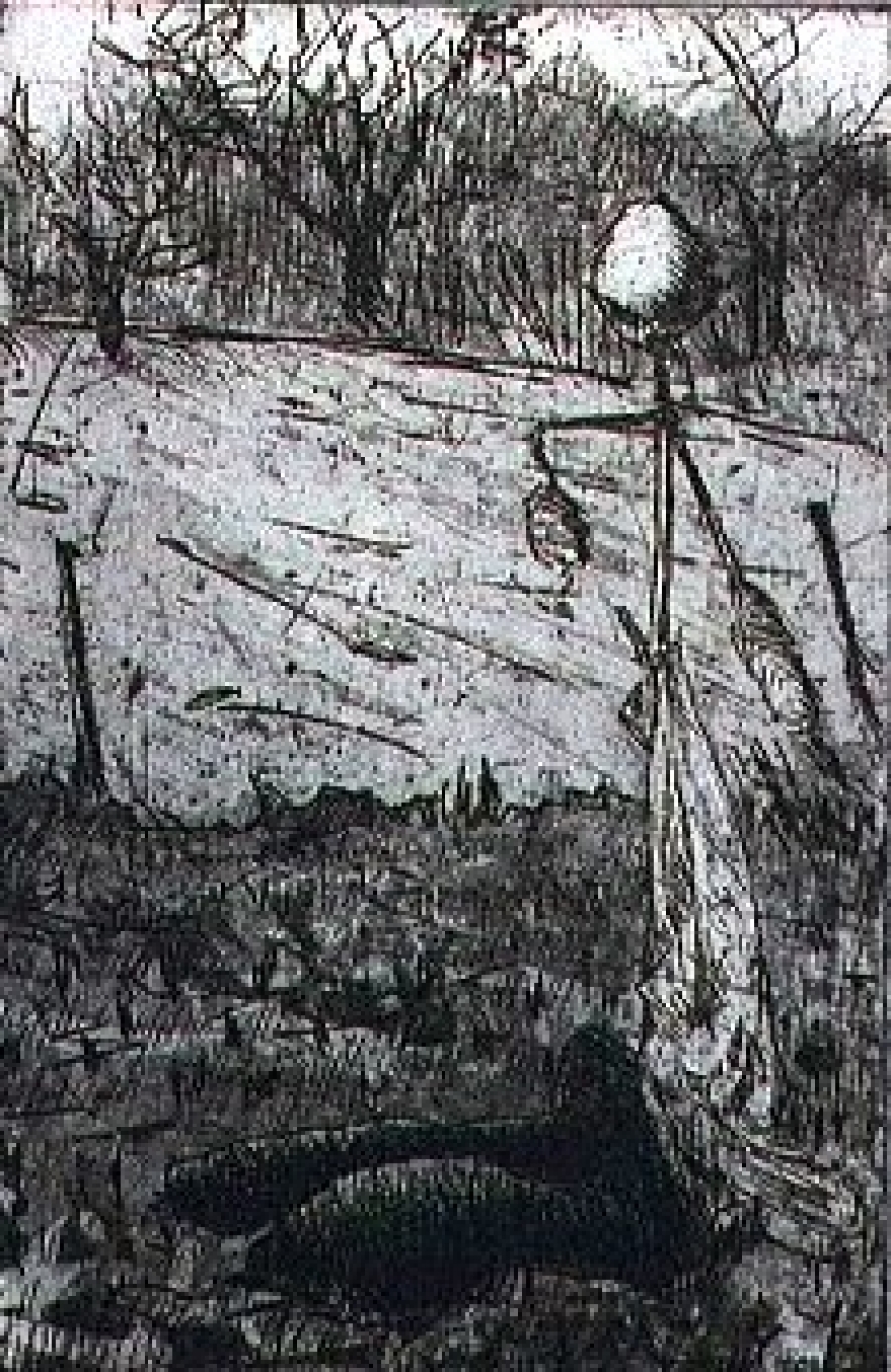 edition of 30 #24 in the Scarecrow series has the scarecrow pared down to it's skeletal structure and facing a late Autumn wind. The print was completed in November of 2000. Exhibited: 60 Square Inches, Purdue University, Purdue, Indiana, 2002; Harry McCue, Tompkins County Public Library, Ithaca, NY, 2004; Upstairs Gallery, Ithaca ,NY,2005; West End gallery, Corning, NY, 2006;Harry McCue, Kendall at Ithaca, Ithaca, NY, 2011.