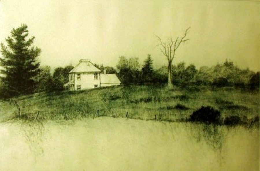 edition of 50 Done in June 1987 from a ball point pen drawing. House and dead elm no longer there. Exhibited: Various venues during late 80s.