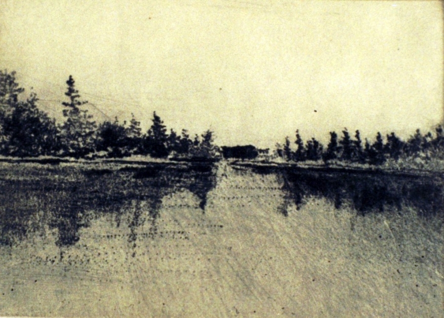 edition of 25 An image from Inlet, NY in the Adirondack region. The plate was done in December of 2005. Exhibited:Finger Lakes Biennial 2007, Rochester Memorial Art Gallery, Rochester, NY,2007; 16th Miniprint Show, Binghamton University Art Gallery, Binghamton, NY,2008; The Water Show, Corners Gallery, Ithaca, NY,2008; Small Wonders '08, Maryland Federation of Arts, Annapolis, MD, 2008.